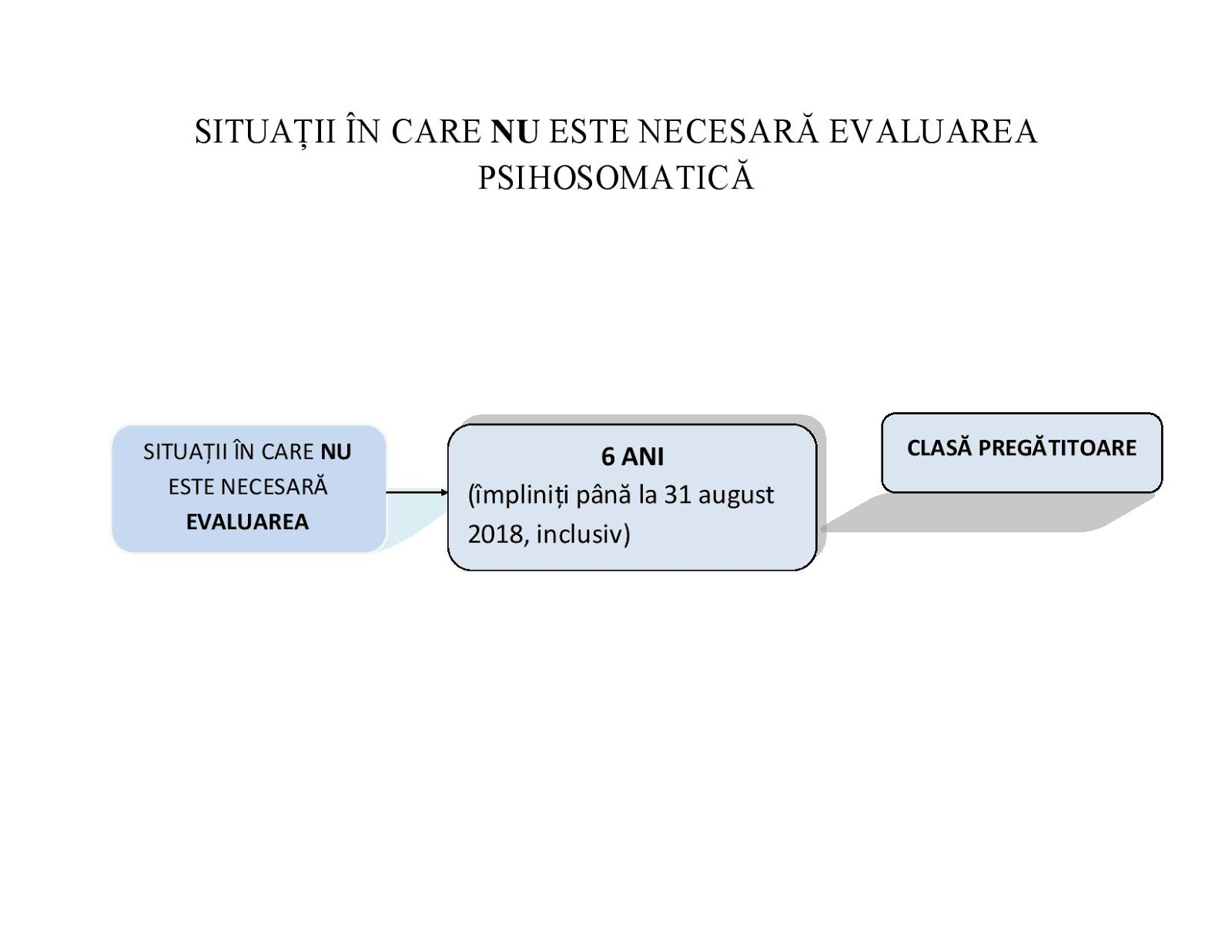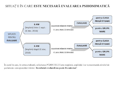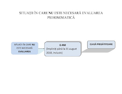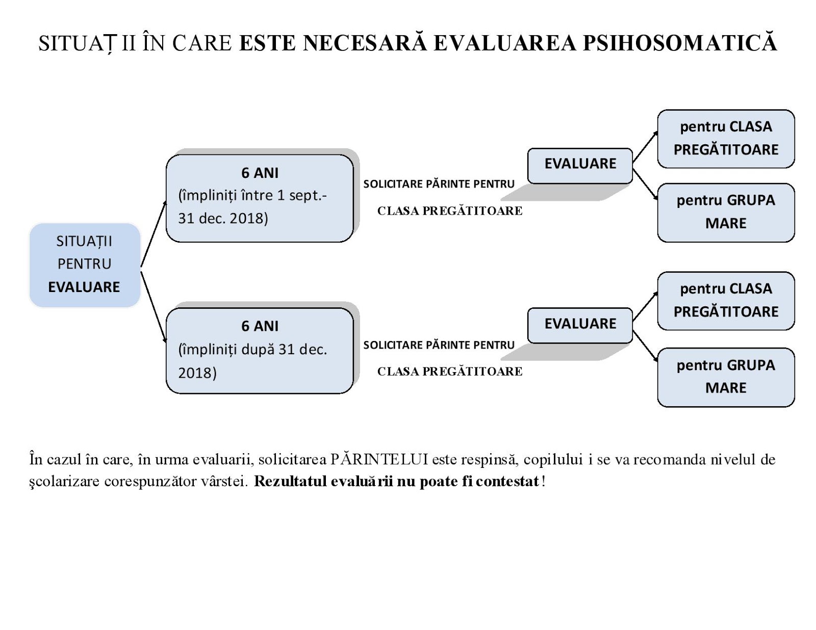 Părinții care solicită înscrierea la clasa pregătitoare a copiilor care împlinesc 6 ani între 01 septembrie – 31 decembrie 2018 sau după 31 decembrie 2018, vor realiza evaluarea psihosomatică după un program stabilit ulterior.